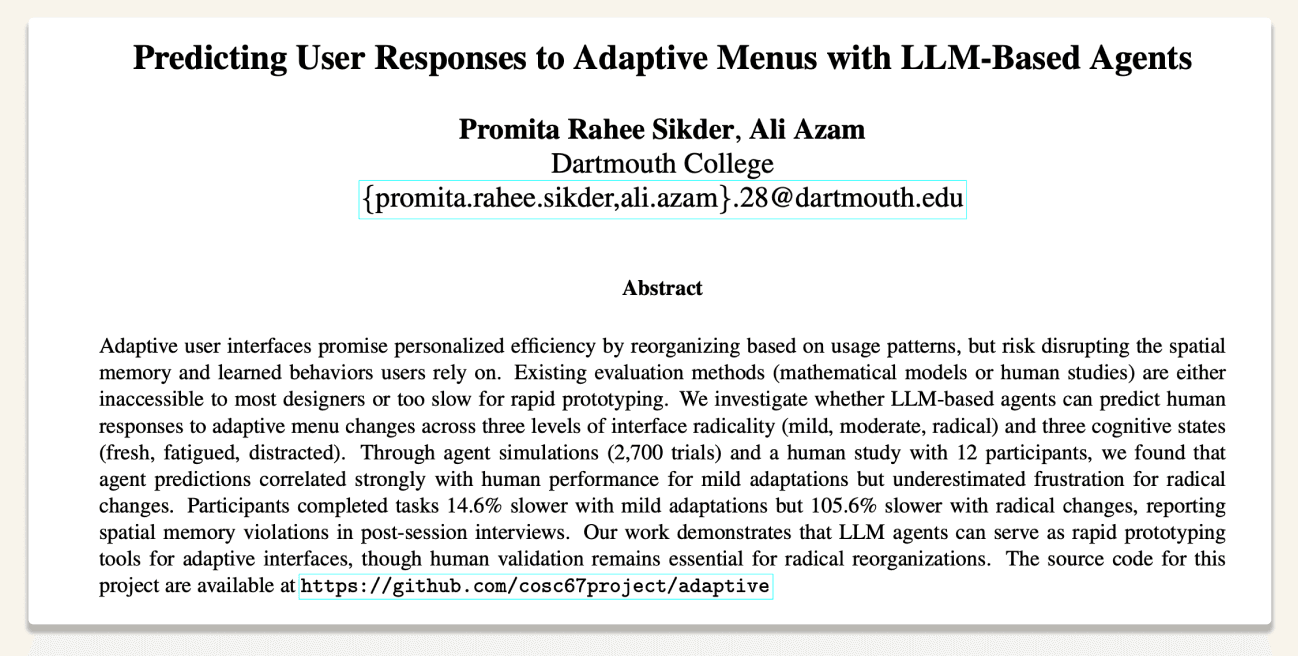 Existing evaluation methods are sometimes inaccessible (model-based RL requiring formal HCI modeling expertise) or slow (human studies with recruitment, compensation, weeks of setup). We were thinking about a third option. Why not see what happens when agents to embody users in a specific cognitive states like fresh, fatigued, distracted and have them predict how a human would respond to a menu that just rearranged itself. We then validated those predictions against actual humans.