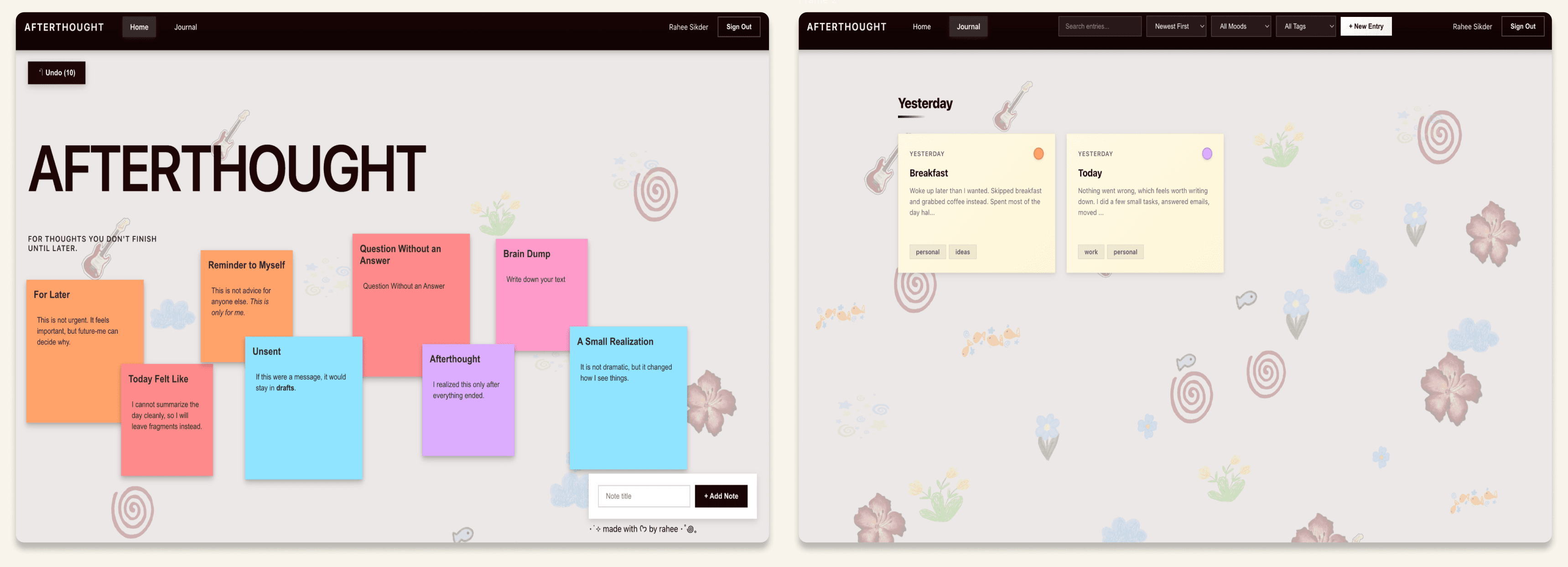Afterthought is a web app for journaling and reflection built around two modes of thinking. The first is a freeform sticky-note canvas where notes are draggable, snapped to a grid, and rendered in markdown. They get a deterministic color, size, and rotation derived from a hash of its ID. The second is a structured markdown journal with mood tracking across six states, comma-separated tagging, and URL-driven filtering and sorting that buckets entries into human-readable time groups (Today, Yesterday, and long-date). Both modes persist to Firebase Realtime Database under per-user paths and update live.