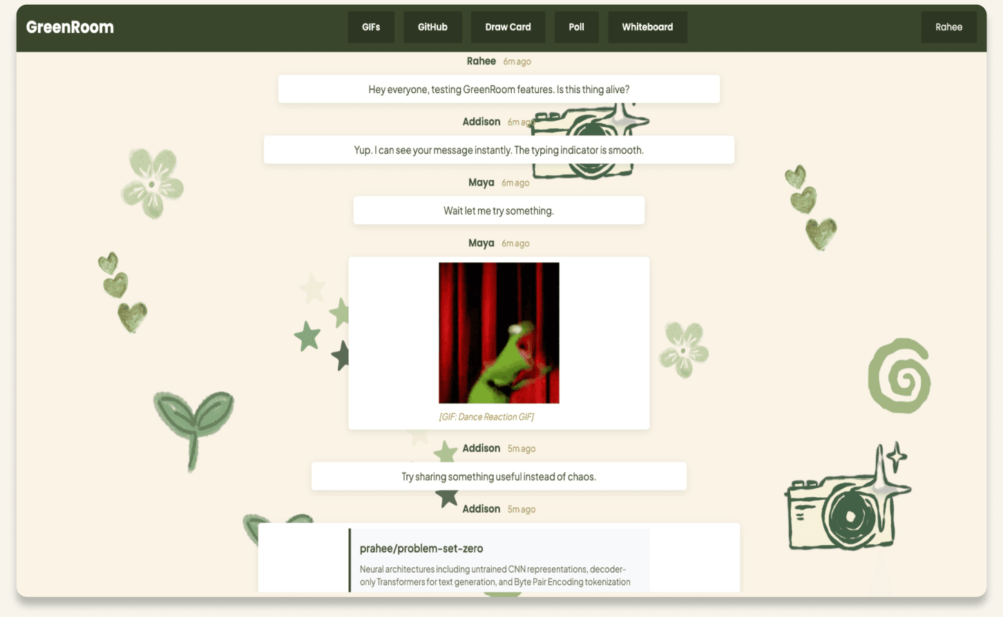 GreenRoom is a collaborative chat platform that goes beyond text since users can search and share GIFs inline, preview GitHub repositories with live star and fork counts, draw random playing cards, run live polls with real-time vote tracking, and sketch together on a shared whiteboard, etc. Everything is stored in MongoDB, so the full history of messages, polls, card draws, and embedded content survives across sessions.